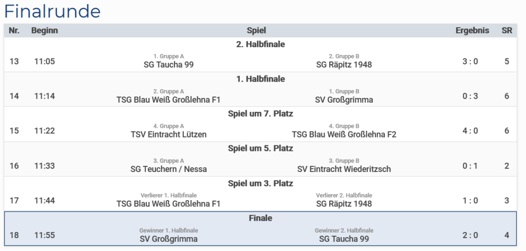 unsere Spiele: Direkt im ersten Spiel gegen die F1 des Gastgebers Großlehna sah man jedoch eine erschreckend ungewohnte Leistung unserer Nachwuchskicker. Ob es am ungewohnten Modus – man spielte mit einem Torhüter und vier statt fünf Feldspielern – lag, oder an der Nervosität kann man nur mutmaßen. Was allerdings auffiel war, dass man direkt gut startete, aber dann sehr schnell abbaute. Kombinierte man sich mit dem Anstoß zunächst schön über eins zwei Stationen vor zu Stürmer Vinjas, verlor man dann den Ball und blieb regungslos stehen, anstatt einen Konter zu unterbinden. Torwart Emil war dann gegen die Überzahl der Angreifern machtlos und griff nach nicht einmal einer Minute hinter sich. Dies sollte sich im ganzen Spiel des Öfteren wiederholen. Em Ende konnte man sich mit einem 0:4 noch glücklich schätzen und zeigte damit eine der schlechtesten Spiele seit September 2025.