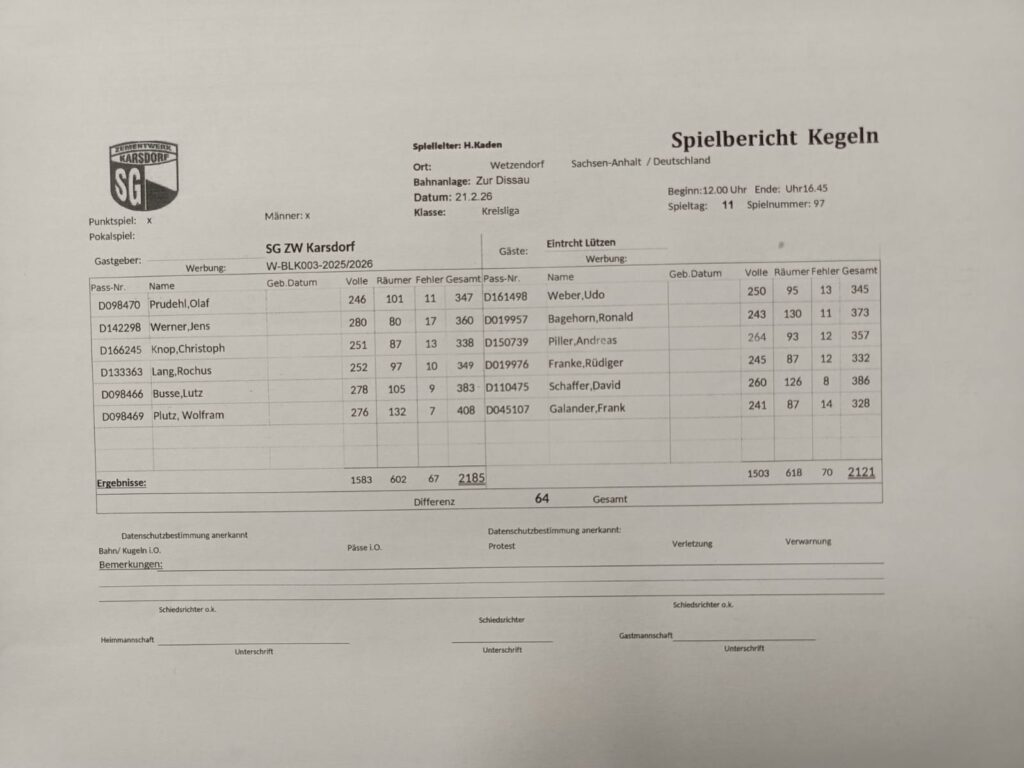 Ergebnis Kegeln Männer 07.02. Veröffentlicht am 23 Februar, 2026 von Rainer Stark SW ZW Karsdorf vs. TSV Eintracht Lützen I